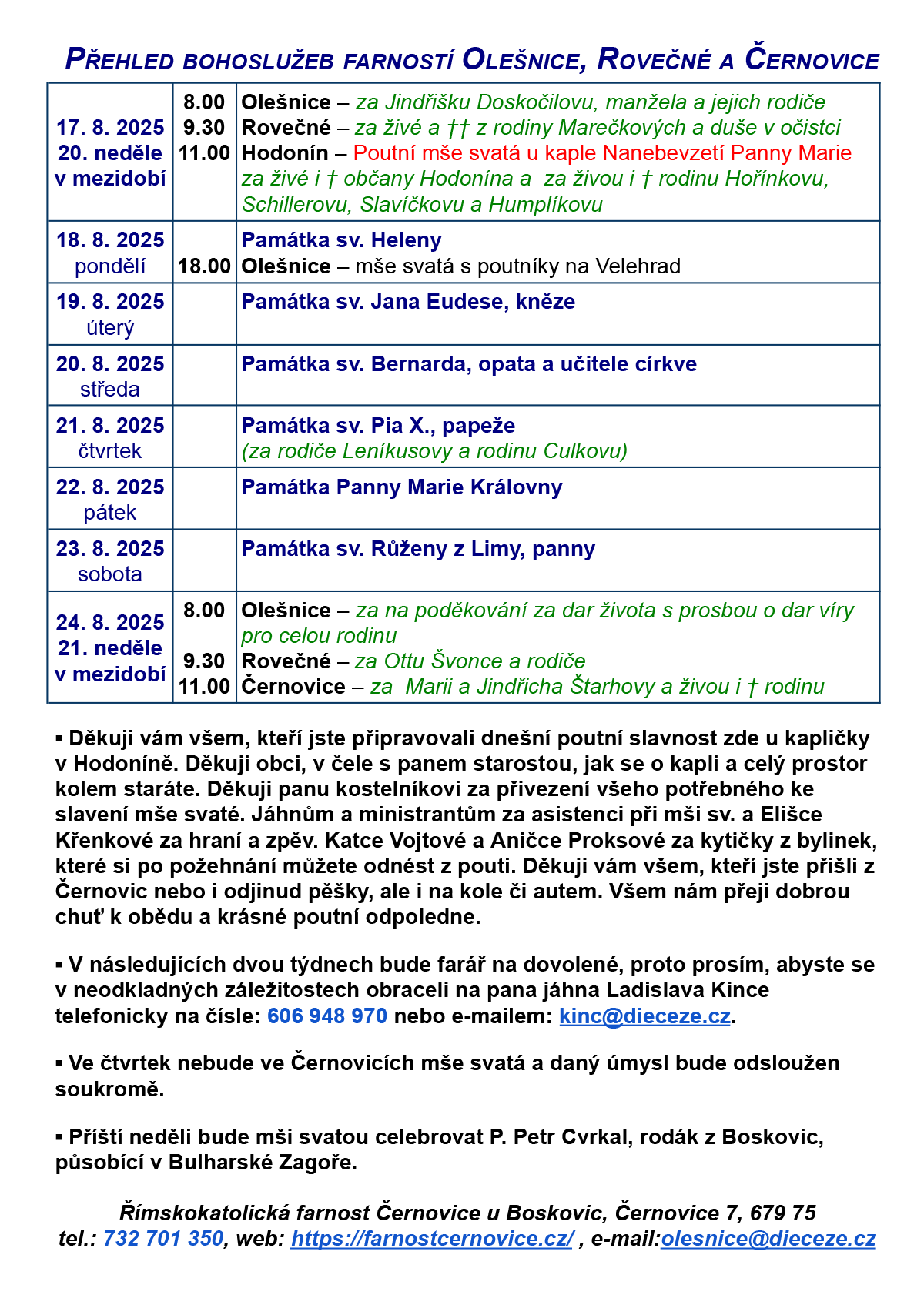 Bohoslužby od 17. do 24. 8. 2025